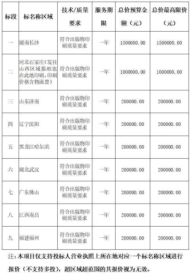 7、投標(biāo)人僅對(duì)所投標(biāo)段進(jìn)行報(bào)價(jià),印刷費(fèi)報(bào)價(jià)應(yīng)根據(jù)套紅印刷(2+1)的每印張報(bào)價(jià),否則視為無效響應(yīng);