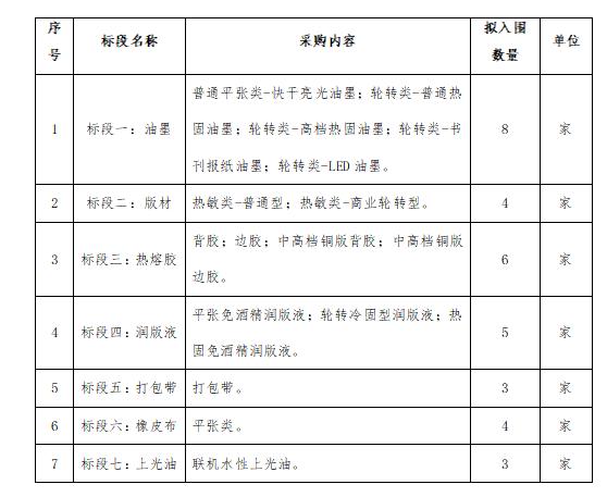 三、征集項(xiàng)目簡介:本項(xiàng)目征集人為中南出版?zhèn)髅郊瘓F(tuán)股份有限公司(以下簡稱“征集人”),湖南省印刷物資有限責(zé)任公司(以下簡稱“采購人”)根據(jù)征集結(jié)果實(shí)施采購,承擔(dān)框架協(xié)議和采購合同的簽訂與執(zhí)行。本次采購范圍為主要印刷輔料,涵蓋油墨、版材、熱熔膠、潤版液、打包帶、橡皮布、上光油七大類,劃分為7個(gè)標(biāo)段。若某標(biāo)段通過資格審查的供應(yīng)商數(shù)量小于擬入圍家數(shù),為保證項(xiàng)目競爭性,推薦入圍供應(yīng)商數(shù)量縮減為N-1,其中N是指通過資格符合性審查的供應(yīng)商的數(shù)量,征集人也有權(quán)針對該標(biāo)段重新組織采購。具體標(biāo)段劃分如下: