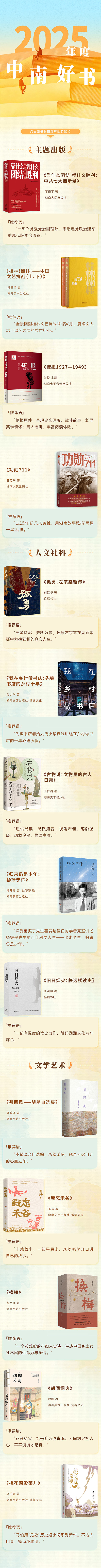 此次評出的2025年度“中南好書”涵蓋主題出版、人文社科、文學藝術、科普生活、少兒等多個門類,既體現(xiàn)湖湘文化底蘊,又展現(xiàn)當代中國與世界對話的廣闊視野;既有學術厚度,也注重大眾表達;既追求思想高度,也兼顧閱讀體驗。