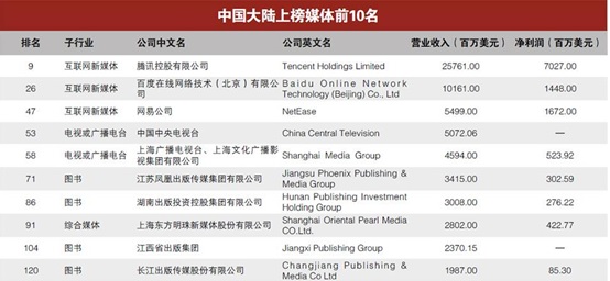 贏利能力最強(qiáng)的媒體公司是谷歌,利潤達(dá)194.78億美元;臉書(Facebook)利潤102.17億美元,排名第二;迪斯尼公司利潤為93.66億美元,排名第三。利潤前十強(qiáng)的媒體公司中,9家來自美國,另外一家是來自中國大陸的騰訊。