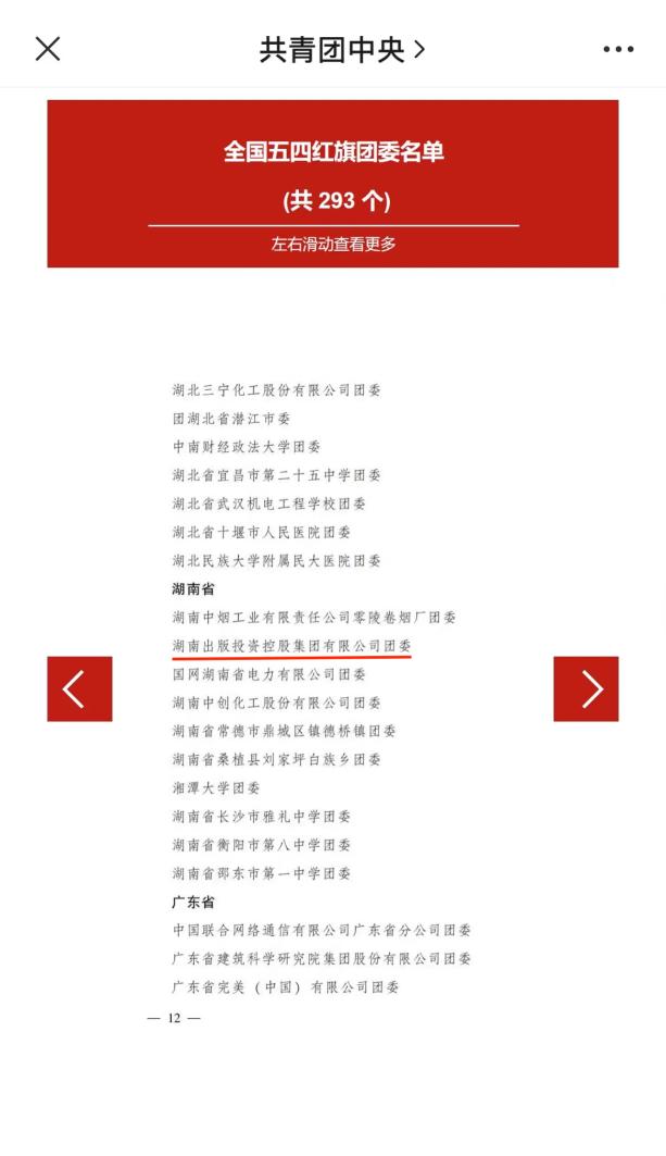 2022年是中國共青團成立100周年。近日,共青團中央作出表彰決定,授予293個團組織全國五四紅旗團委稱號,授予377個團組織全國五四紅旗團支部稱號,授予457人(含追授3人)全國優(yōu)秀共青團員稱號,授予341人(含追授1人)全國優(yōu)秀共青團干部稱號。湖南出版投資控股集團有限公司團委榮獲全國五四紅旗團委稱號。